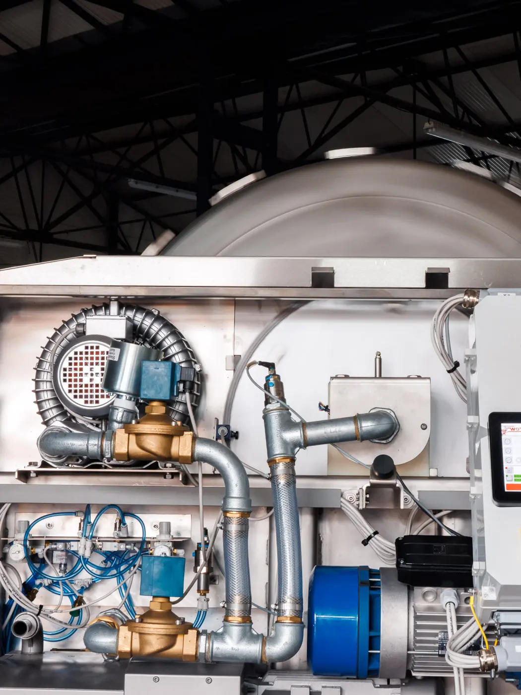 Zentrales Element der neuen Anlage ist der Übernahmetrog: „Der ermöglicht es anders als zuvor Trauben abzuladen, während die Presse läuft.“ Von hier aus gelangen die Trauben über die eine Schnecke in die Presse – optional auch über die Abbeermaschine. Die andere, gegenläufige Schnecke führt in die Rotweintanks, wo die Maische erst vergärt, bevor sie über eine Rutsche wieder im Übernahmetrog landet. Dort wird sie teilentsaftet und schließlich in die Presse befördert. „Komplett ohne störenden Pumpvorgang nach der Gärung“, betont Martin die Vorteile des technischen Konzepts. „Wir verarbeiten Hand- und Maschinenernten gleichermaßen. Die gesamte Steuerung erfolgt zentral.“