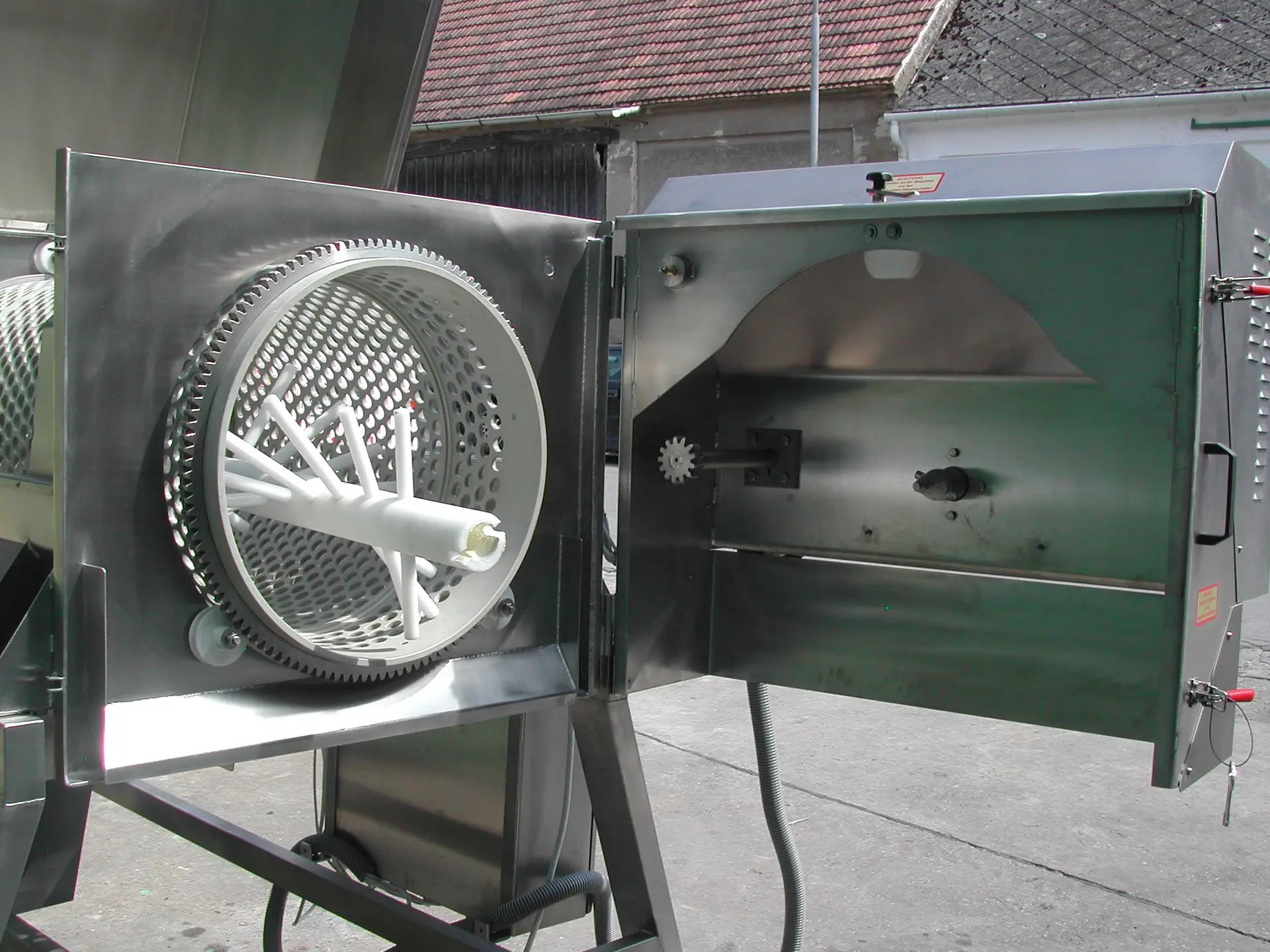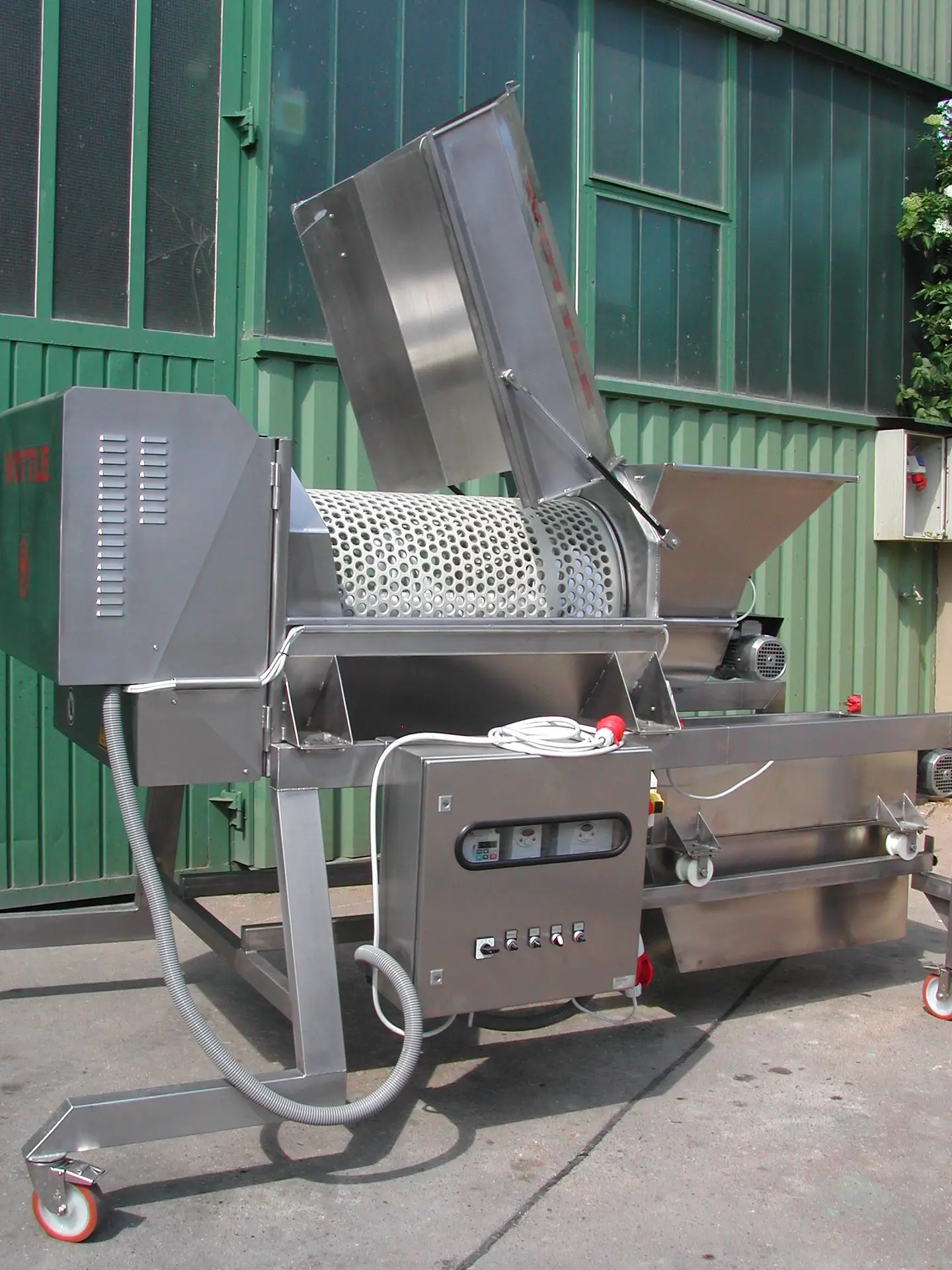Bei den Komponentenabbeermaschinen A3 und A4 werden der Abbeerkorb, die Abbeerwelle, die Quetscheinheit und die Einzugsschnecke jeweils separat angetrieben und können somit auch einzeln gesteuert werden. Die Steuerung erfolgt über den zentralen Schaltkasten, der neben dem Zugang zu voreingestellten Programmen auch die Möglichkeit individueller Feinjustierungen eröffnet. So können alle Prozesse bestmöglich auf den Zustand des Ausgangsmaterials abgestimmt und eine entsprechend hohe Verarbeitungsqualität erzielt werden. Eine zentrale Bedeutung kommt dabei der Einzugsschnecke zu: Über diese wird die Materialzufuhrmenge in den Abbeervorgang geregelt - erfordert der Zustand des Ausgangsmaterials also ein möglichst schonendes (langsames) Abbeeren, wird einfach die Drehgeschwindigkeit der Schnecke minimiert.