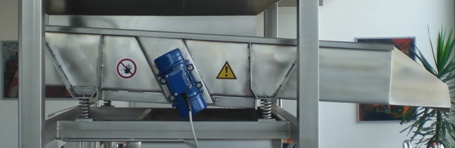 Im Bild zu sehen: Rütteltisch mit leichter Neigung und einem der beiden seitlich angebrachten Unwuchtmotoren (blau). Das technische Konzept umfasst die Lagerung des Tischs auf stabilen Stahlfedern.